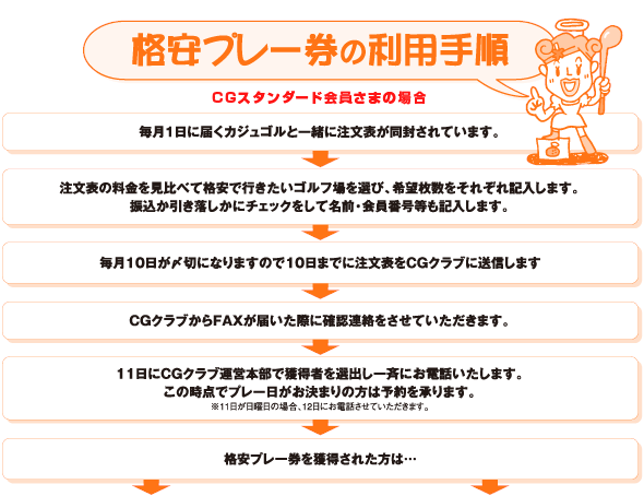 ※ パソコンがご利用いただけない方は、CGクラブまでご連絡ください。こちらからFAXにて再送いたします。また格安プレー券の在庫状況をお知りになりたい場合は、お気軽にCGクラブまでご連絡ください。