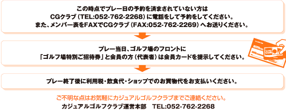 ※ 「格安プレー券」を購入後、エントリーを行う際には必ず、カジュアルゴルフクラブ運営本部(TEL:052-762-2268)へご連絡ください。メンバーがお決まり次第カジュアルゴルフクラブ運営本部へFAX(052-762-2269)にてメンバー表をお送りください。特別なプレー券のため直接ゴルフ場に連絡することのないようにお願いいたします。